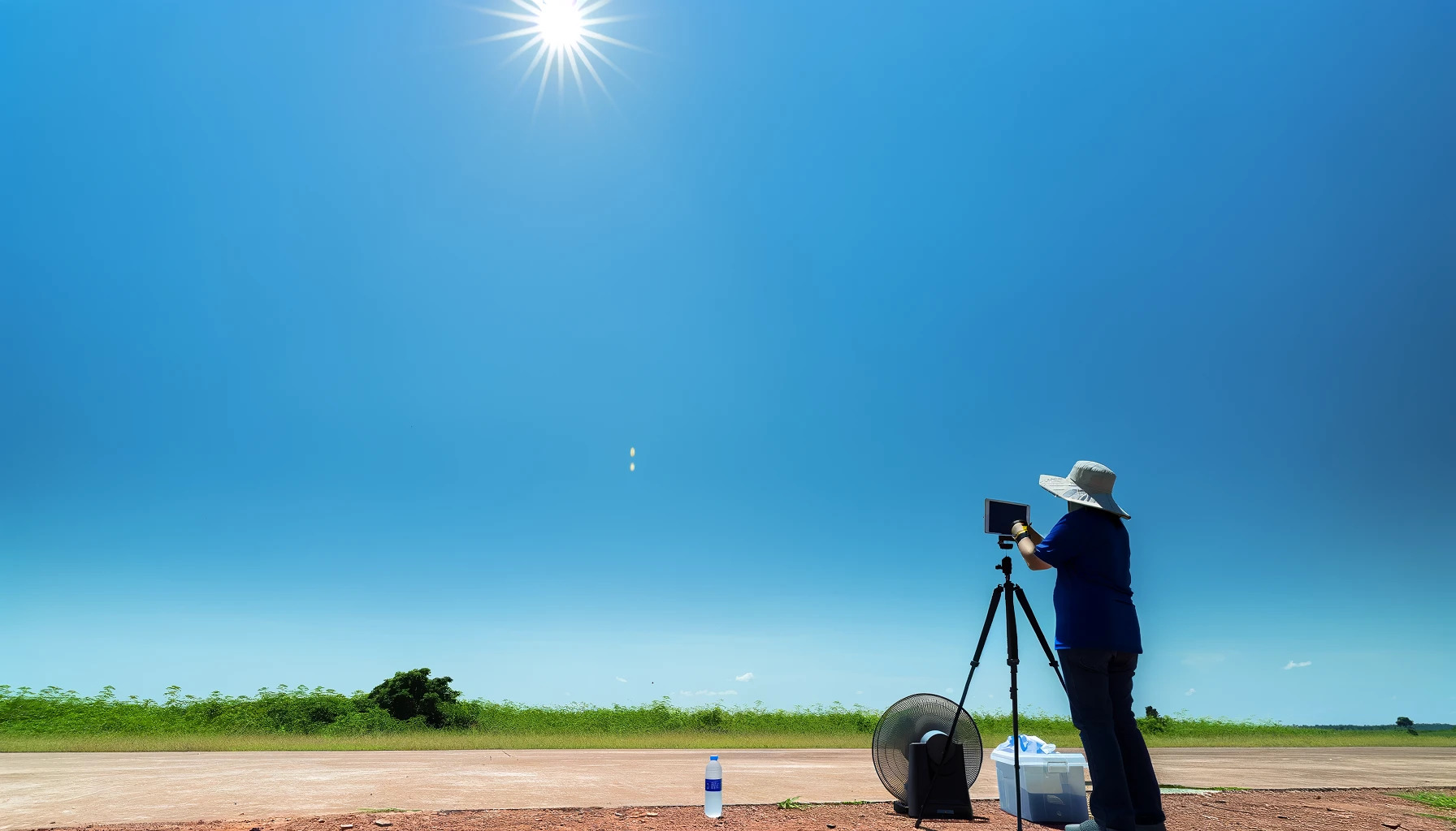 A simple outdoor scene with a bright sun shining in a clear blue sky. A single person is filming with an iPad, standing in an open area. The person is wearing a hat and sunglasses for sun protection. Nearby, a water bottle and a portable fan are placed on the ground, indicating measures taken to manage the heat.